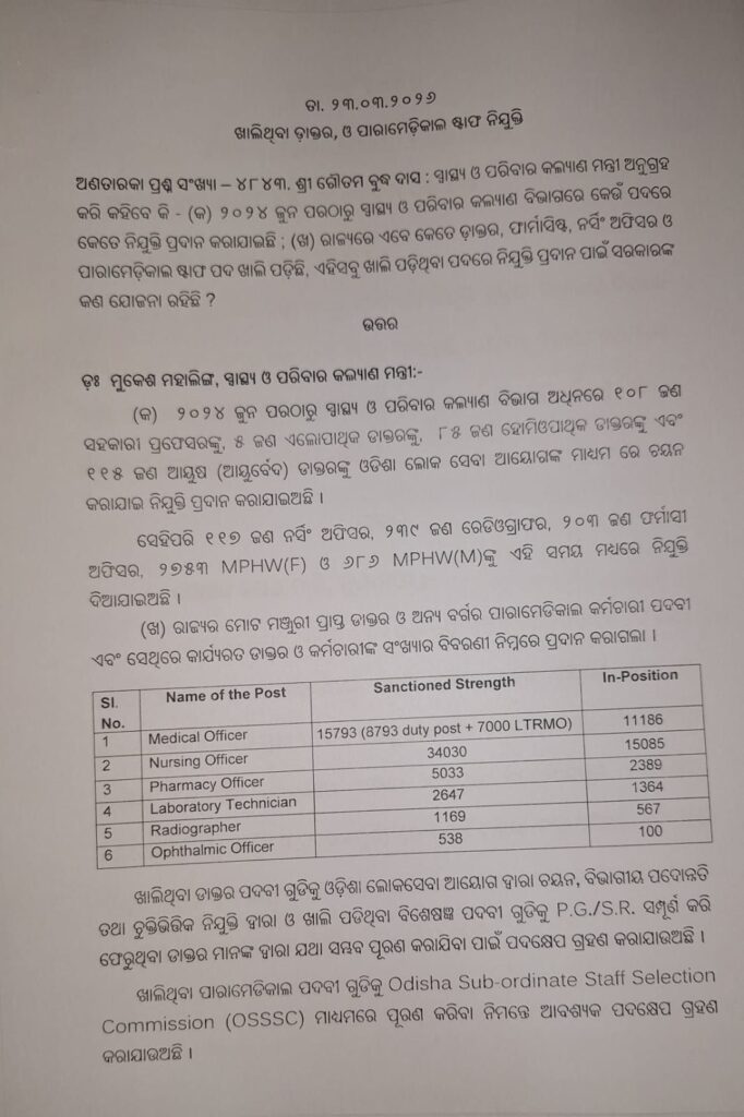 ଭୁବନେଶ୍ୱର,୨୩/୦୩:ସରକାରୀ ମେଡିକାଲରେ ଖାଲି ଚେୟାର। ହଜାର ହଜାର ପଦବୀ ଖାଲି।4107 ମେଡିକାଲ ଅଫିସର ପଦବୀ ଖାଲି। 15 ହଜାର 793 ମେଡିକାଲ ଅଫିସର ଥିବା ବେଳେ 11 ହଜାର 186 ମେଡିକାଲ ଅଫିସର ଅଛନ୍ତି।ସେହିଭଳି 18 ହଜାର 945 ନର୍ସିଙ୍ଗ ଅଫିସର,2644 ଫର୍ମାସୀ ଅଫିସର, 1283 ଲାଇବ୍ରେରୀ ଟେକନିସିଆନ, 602 ରେଡ଼ିଓ ଗ୍ରାଫର, 438 ଓଫଥାଲମିକ ଅଫିସର ଖାଲି।ଅନ୍ୟପଟେ ନୂଆ ସରକାର ଆସିବା ପରେ ସ୍ବାସ୍ଥ୍ୟ ଓ ପରିବାର କଲ୍ୟାଣ ବିଭାଗ ଅଧୁନରେ ୧୦୮ ଜଣ ସହକାରୀ ପ୍ରଫେସରଙ୍କୁ, ୫ ଜଣ ଏଲୋପାଥ୍କ ଡାକ୍ତରଙ୍କୁ, ୮୫ ଜଣ ହୋମିଓପାଥ୍କ ଡାକ୍ତରଙ୍କୁ ଏବଂ ୧୧୫ ଜଣ ଆୟୁଷ (ଆୟୁର୍ବେଦ) ଡାକ୍ତରଙ୍କୁ ଓଡିଶା ଲୋକ ସେବା ଆୟୋଗଙ୍କ ମାଧ୍ୟମ ରେ ଚୟନ କରାଯାଇ ନିଯୁକ୍ତି ପ୍ରଦାନ କରାଯାଇଛି।ସେହିପରି ୧୧୭ ଜଣ ନସିଂ ଅଫିସର, ୨୩୯ ଜଣ ରେଡିଓଗ୍ରାଫର, ୨୦୩ ଜଣ ଫର୍ମାସୀ ଅଫିସର, ୨୭୫୩ MPHW(F) ଓ ୬୮୬ MPHW(M)ଙ୍କୁ ଏହି ସମୟ ମଧ୍ୟରେ ନିଯୁକ୍ତି ଦିଆଯାଇଅଛି। ଗୃହରେ ସ୍ୱାସ୍ଥ୍ୟ ମନ୍ତ୍ରୀଙ୍କ ଉତ୍ତର।