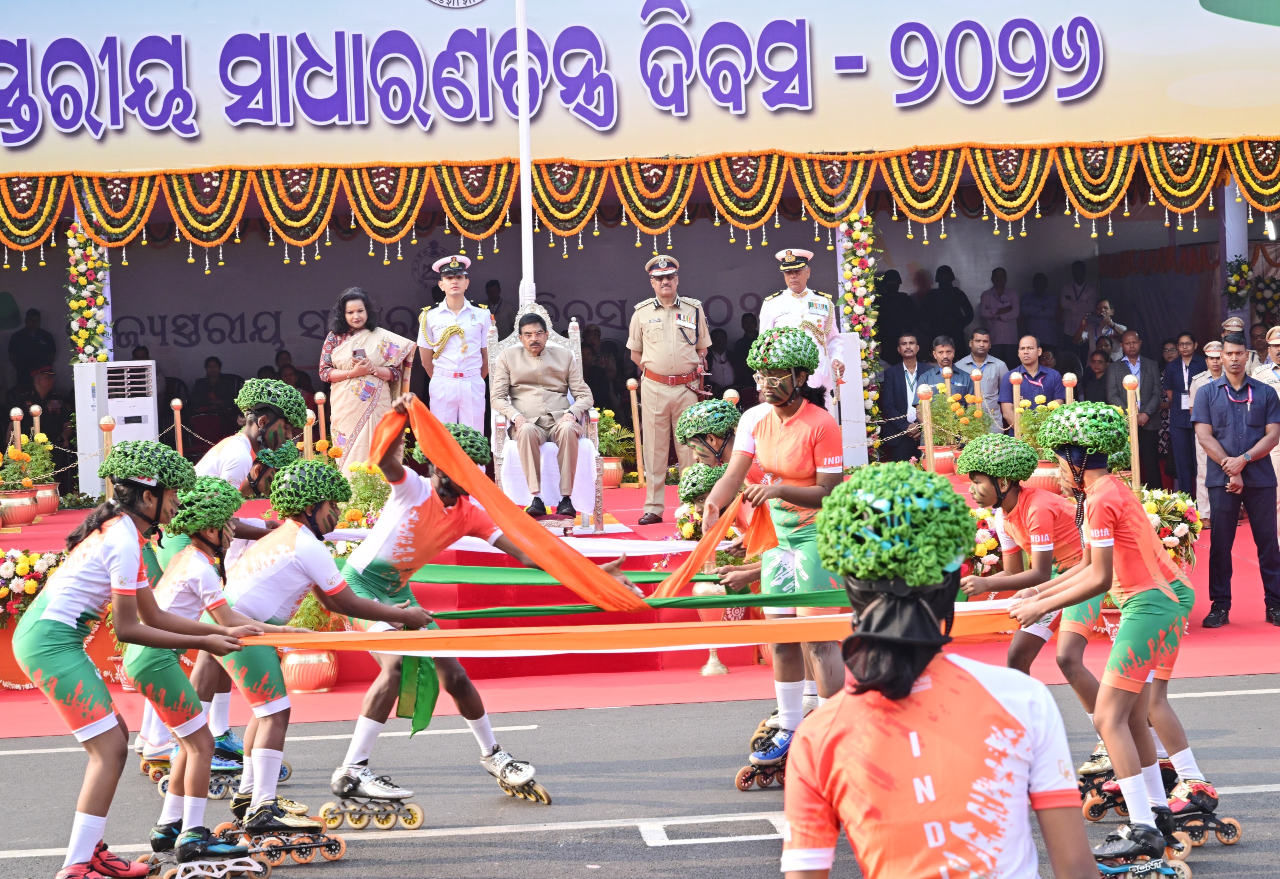 ଶ୍ରୀ ହେମନ୍ତ ଶର୍ମା, ଆରକ୍ଷୀ ମହାନିର୍ଦ୍ଦେଶକ ଶ୍ରୀ ୱା. ବି. ଖୁରାନିଆ, ଜାତୀୟ ସମର ଶିକ୍ଷାର୍ଥୀ ବାହିନୀର ଉପମହାନିର୍ଦ୍ଦେଶକ କମୋଡର ବିକ୍ରମ ସିଂହ ରାଜ୍ୟପାଳଙ୍କୁ ସ୍ୱାଗତ ଜଣାଇ ମଞ୍ଚ ନିକଟକୁ ପାଛୋଟି ନେଇଥିଲେ । ରାଜ୍ୟପାଳ ଡ. ହରି ବାବୁ କମ୍ଭମ୍‌ପାଟି ୮.୩୦ ମିନିଟ୍‌ ସମୟରେ ଜାତୀୟ ପତାକା ଉତ୍ତୋଳନ କରିଥିଲେ । ପରେଡ୍‌ କମାଣ୍ଡାଣ୍ଟ ଶ୍ରୀ ରାକେଶ କୁମାର ସାହୁ, ଏସ୍‌ଡିପିଓ, ଆର୍‌. ଉଦୟଗିରି ପ୍ୟାରେଡ୍‌ ପରିଚାଳନା କରିଥିଲେ । ଦ୍ୱିତୀୟ ପରିଚାଳକ ଭାବେ ଡେପୁଟି କମାଣ୍ଡାଣ୍ଟ ଶ୍ରୀ ଶରତ ଜାନି, ଆଡ୍‌ଜୁଟାଣ୍ଟ ଭାବେ ଶ୍ରୀ ଶେଖର ମହାପାତ୍ର ଏବଂ ସ୍ୱତନ୍ତ୍ର ଅଧିକାରୀ ଶ୍ରୀ ପରମେଶ୍ୱର ହାଂସଦା ପ୍ୟାରେଡ୍‌ ପରିଚାଳନାରେ ସହାୟତା କରିଥିଲେ ।