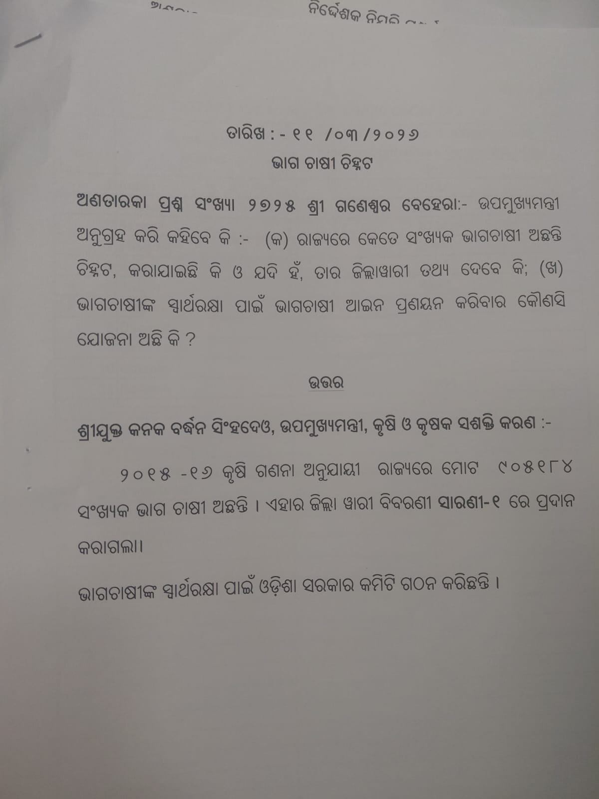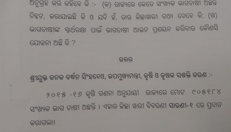 ଭୁବନେଶ୍ଵର,୧୧/୦୩: ରାଜ୍ୟରେ ଭାଗଚାଷୀଙ୍କ ସଂଖ୍ୟା ସମ୍ପର୍କରେ ସରକାର ବିଧାନସଭାରେ ତଥ୍ୟ ଦେଇଛନ୍ତି। ବିଧାୟକ ଗଣେଶ୍ୱର ବେହେରା ଙ୍କ ପ୍ରଶ୍ନର ଉତ୍ତରରେ ଉପମୁଖ୍ୟମନ୍ତ୍ରୀ କନକ ବର୍ଦ୍ଧନ ସିଂହଦେଓ ଏହି ସୂଚନା ପ୍ରଦାନ କରିଥିଲେ।