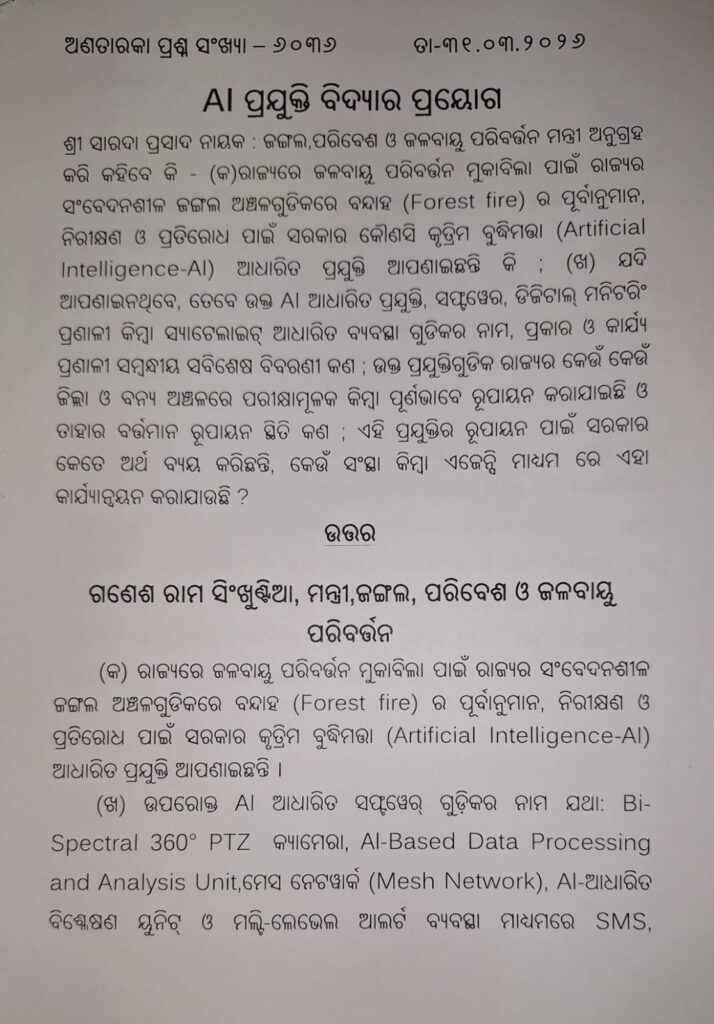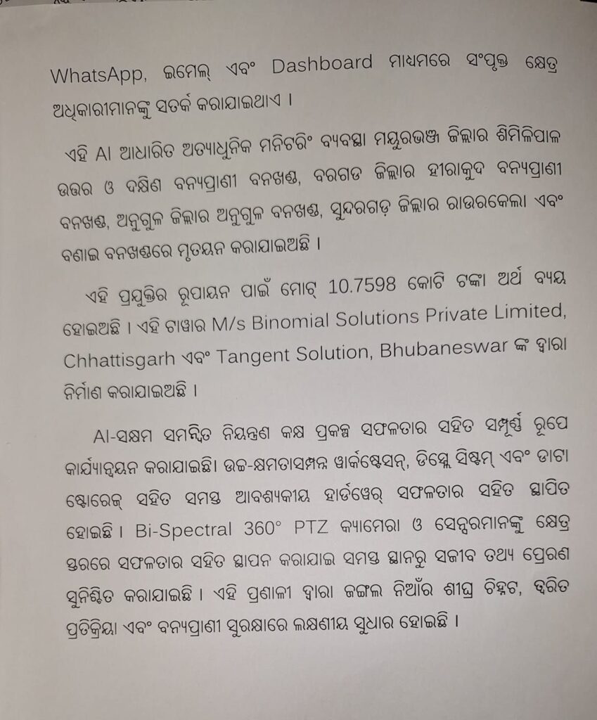 ମୟୁରଭଞ୍ଜ ଜିଲ୍ଲାର ଶିମିଳିପାଳ ଉତ୍ତର ଓ ଦକ୍ଷିଣ ବନ୍ୟପ୍ରାଣୀ ବନଖଣ୍ଡ, ବରଗଡ ଜିଲ୍ଲାର ହୀରାକୁଦ ବନ୍ୟପ୍ରାଣୀ ବନଖଣ୍ଡ, ଅନୁଗୁଳ ଜିଲ୍ଲାର ଅନୁଗୁଳ ବନଖଣ୍ଡ, ସୁନ୍ଦରଗଡ଼ ଜିଲ୍ଲାର ରାଉରକେଲା ଏବଂ ବଣାଇ ବନଖଣ୍ଡରେ ଏହି AI ଆଧାରିତ ଅତ୍ୟାଧୁନିକ ମନିଟରିଂ ବ୍ୟବସ୍ଥା କରାଯାଇଛି।ଏହି ପ୍ରଯୁକ୍ତିର ରୂପାୟନ ପାଇଁ ମୋଟ୍ 10.7598 କୋଟି ଟଙ୍କା ଅର୍ଥ ଖର୍ଚ୍ଚ ହୋଇଛି।ଏହା ସହ ତଥ୍ୟ କହୁଛି 2024 ରେ 4 ହଜାର 67 ଏବଂ 2025 ରେ 4 ହଜାର 609 ହେକ୍ଟର ଜଙ୍ଗଲ ପ୍ରଭାବିତ ହୋଇଛି ବୋଲି ବିଧାନସଭାରେ ଉତ୍ତର ରଖିଛନ୍ତି ଜଙ୍ଗଲ ଓ ପରିବେଶ ମନ୍ତ୍ରୀ।