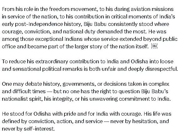 ସେ ଗର୍ବର ସହିତ ଓଡ଼ିଶା ପାଇଁ ଏବଂ ସାହସର ସହିତ ଭାରତ ପାଇଁ ଠିଆ ହୋଇଥିଲେ। ତାଙ୍କ ଜୀବନ ଦୃଢ଼ ବିଶ୍ୱାସ, କାର୍ଯ୍ୟ ଏବଂ ସେବା ଦ୍ୱାରା ପରିଭାଷିତ ହୋଇଥିଲା – କେବେ ଦ୍ୱିଧା ଦ୍ୱାରା ନୁହେଁ, କେବେ ସ୍ୱାର୍ଥ ଦ୍ୱାରା ନୁହେଁ ।ଓଡ଼ିଶାବାସୀଙ୍କ ପାଇଁ, ବିଜୁ ବାବୁ ଗର୍ବ, ଐତିହ୍ୟ, ପରିଚୟ ଏବଂ ସମ୍ମାନର ପ୍ରତିନିଧିତ୍ୱ କରନ୍ତି। ତାଙ୍କର ଅବଦାନ ଗମ୍ଭୀରତାର ଯୋଗ୍ୟ। ତାଙ୍କର ଐତିହ୍ୟ ସମ୍ମାନ ପାଇବା ଉଚିତ ଏବଂ ବିଜୁ ବାବୁଙ୍କୁ ସର୍ବଦା ଭାରତର ଜଣେ ଦୃଢ଼ ଜାତୀୟତାବାଦୀ ଏବଂ ଓଡ଼ିଶାର ଜଣେ ଗର୍ବିତ ପୁତ୍ର ଭାବରେ ମନେ ରଖାଯିବ।