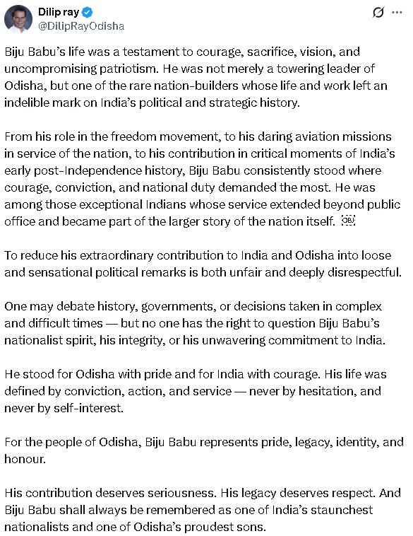 ଭୁବନେଶ୍ୱର,୩୦/୦୩:ବିଜୁ ପଟନାୟକଙ୍କ ପ୍ରତି ସାଂସଦ ନିଶିକାନ୍ତ ଦୁବେଙ୍କ ମନ୍ତବ୍ୟ ପରେ ଦିଲ୍ଲୀପ ରାୟଙ୍କ ସୋସିଆଲ ମିଡ଼ିଆ ପୋଷ୍ଟ।ଭାରତ ଏବଂ ଓଡ଼ିଶା ପ୍ରତି ତାଙ୍କର ଅସାଧାରଣ ଅବଦାନକୁ ଶସ୍ତା ଏବଂ ଚାଞ୍ଚଲ୍ୟକର ରାଜନୈତିକ ମନ୍ତବ୍ୟରେ ହ୍ରାସ କରିବା ଅନ୍ୟାୟ ଏବଂ ଗଭୀର ଅସମ୍ମାନଜନକ ।ଇତିହାସ, ସରକାର କିମ୍ବା ଜଟିଳ ଏବଂ କଷ୍ଟକର ସମୟରେ ନିଆଯାଇଥିବା ନିଷ୍ପତ୍ତି ଉପରେ କେହି ବିତର୍କ କରିପାରିବେ – କିନ୍ତୁ ବିଜୁ ବାବୁଙ୍କ ଜାତୀୟତାବାଦୀ ଆତ୍ମା, ତାଙ୍କ ସାଧୁତା କିମ୍ବା ଭାରତ ପ୍ରତି ତାଙ୍କର ଅଟଳ ପ୍ରତିବଦ୍ଧତା ଉପରେ ପ୍ରଶ୍ନ ଉଠାଇବାର ଅଧିକାର କାହାର ନାହିଁ ।