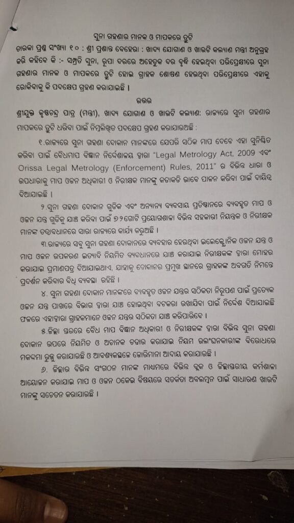 ଭୁବନେଶ୍ଵର,୧୮/୦୨:ବଡ଼ ବଡ଼ ସୋ ରୁମ୍ ରୁ ସୁନା କିଣୁଛନ୍ତି କି ତେବେ ହୁଅନ୍ତୁ ସାବଧାନ ।ମାପରେ ଠକୁଛନ୍ତି ସୁନା ଦୋକାନୀ।ମାପରେ ତ୍ରୁଟି ପାଇଁ ଗୋଟିଏ ବର୍ଷରେ 7 ଜୁଏଲାରୀ ଦୋକାନ ଉପରେ ହୋଇଛି ଆକ୍ସନ।ଆଦାୟ ହୋଇଛି 80 ହଜାର ଜରିମାନା।ଏଥିରେ ବହୁ ବଡ଼ ବଡ଼ ଜୁଏଲାରୀ ବ୍ରାଣ୍ଡର ନାଁ ବି ରହିଛି।କେନ୍ଦୁଝରର 3 ଟି ସୋ ରୁମ୍ ,ସମ୍ବଲପୁରର 2 ଟିଏବଂ ସୁନ୍ଦରଗଡ଼ ଏବଂ ପୁରୀରେ ଗୋଟିଏ ଦୋକାନ ରହିଛି।ବିଧାନସଭାରେ ଯୋଗାଣ ମନ୍ତ୍ରୀଙ୍କ ଉତ୍ତର କହୁଛି ଗତ 4 ବର୍ଷରେ 23ଟି ଗହଣା ଦୋକାନ ବା ପ୍ରତିଷ୍ଠାନ ମାପରେ ତ୍ରୁଟି କରୁଥିବା ଧରା ପଡିଛନ୍ତି, ସେମାନଙ୍କ ଠାରୁ 5 ଲକ୍ଷ 18 ହଜାର ଟଙ୍କାର ଜରିମାନା ଆଦାୟ ହୋଇଛି।