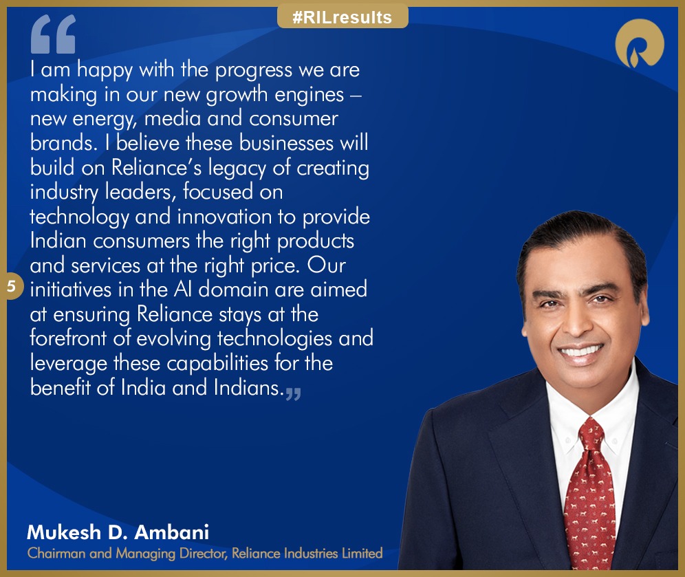 ଆଜି ଘୋଷଣା ହୋଇଥିବା ରିଲାଏନ୍ସ ଇଣ୍ଡଷ୍ଟ୍ରିଜର ଚଳିତ ଆର୍ଥିକ ବର୍ଷର ଦ୍ୱିତୀୟ ତ୍ରୈମାସିକ ଆର୍ଥିକ ଫଳାଫଳ ଅନୁଯାୟୀ କମ୍ପାନୀର ନେଟ ଲାଭ ଗତ ବର୍ଷ ସମାନ ଅବଧି ତୁଳନାରେ ୧୪.୩ ପ୍ରତିଶତ ଅଧିକ ରହିଛି ଏବଂ ୨୨୦୯୨ କୋଟି ଟଙ୍କାରେ ପହଞ୍ଚିଛି । ଏହି ତ୍ରୈମାସିକରେ କମ୍ପାନୀର ମୋଟ ରାଜସ୍ବ ଗତବର୍ଷ ସମାନ ସମୟ ତୁଳନାରେ ୯.୯ ପ୍ରତିଶତ ବୃଦ୍ଧି ପାଇ ୨୮୩୫୪୮ କୋଟି ଟଙ୍କା ହୋଇଛି।