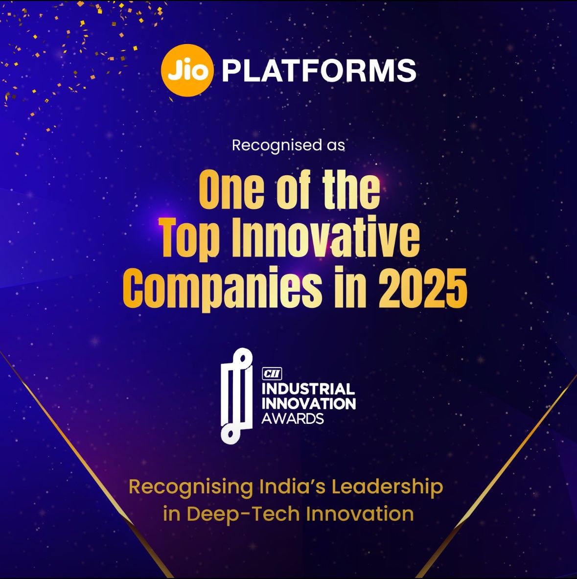 ସରକାରୀ ତଥ୍ୟ ସହିତ, ଉଦ୍ୟୋଗ ଜଗତ ମଧ୍ୟ ଜିଓକୁ ଏକ ଶକ୍ତିଶାଳୀ ବିଶ୍ୱସ୍ତରୀୟ ଆଇପି ପ୍ଲେୟାର ଭାବରେ ମାନ୍ୟତା ଦେଇଛି। ନିକଟରେ ସିଆଇଆଇ ଇଣ୍ଡଷ୍ଟ୍ରିଆଲ ଇନୋଭେସନ ପୁରସ୍କାର ୨୦୨୫ ରେ ଜିଓ ପ୍ଲାଟଫର୍ମସକୁ ଭାରତର ଶ୍ରେଷ୍ଠ ୨୦ ଟି ଇନୋଭେଟିଭ କମ୍ପାନୀ ମଧ୍ୟରେ ସାମିଲ କରାଯାଇଥିଲା ଏବଂ ବଡ଼ ଆଇସିଟି ବର୍ଗରେ ‘ଶ୍ରେଷ୍ଠ ପେଟେଣ୍ଟ ପୋର୍ଟଫୋଲିଓ’ ପାଇଁ ରନର୍ସ-ଅପ୍ ପୁରସ୍କାର ମଧ୍ୟ ମିଳିଥିଲା।