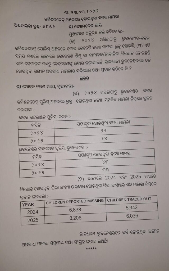 ଭୁବନେଶ୍ୱର,୨୩/୦୩:ଭୁବନେଶ୍ୱର ହତ୍ୟାକାଣ୍ଡ ମାମଲା କମୁଛି, ହେଲେ କଟକରେ ବଢ଼ି ଚାଲିଛି।2024 ରେ କଟକରେ 21 ଟି ହତ୍ୟା ମାମଲା ପଞ୍ଜିକୃତ ହୋଇଥିବା ବେଳେ ଏହି ସଂଖ୍ୟା 2025 ରେ ବଢ଼ି 24 ରେ ପହଁଚିଲା।ଭୁବନେଶ୍ୱରରେ ହତ୍ୟାକାଣ୍ଡ ସଂଖ୍ୟା ଅଧିକ ରହିଥିଲେ ବି 2024 ତୁଳନାରେ 2025 ରେ ଏହା କମିଛି। 2024 ରେ ଭୁବନେଶ୍ୱରରେ 43 ଟି ହତ୍ୟାକାଣ୍ଡ ମାମଲା ପଞ୍ଜିକରଣ ହୋଇଥିଲା ଯାହା 2025 ରେ କମି 33 ରେ ରହିଥିଲା। ଗୃହରେ ମୁଖ୍ୟମନ୍ତ୍ରୀ ମୋହନ ମାଝୀଙ୍କ ଲିଖିତ ଉତ୍ତରରୁ ଏହା ସ୍ପଷ୍ଟ ହୋଇଛି।ଅନ୍ୟପଟେ ରାଜ୍ୟରେ ବଢୁଛି ଶିଶୁ ନିଖୋଜ ମାମଲା ବଢ଼ିବାରେ ଲଗିଛି।2024 ରେ 6838 ଶିଶୁ ନିଖୋଜ ହୋଇଥିବାବେଳେ 5942 ଜଣ ଉଦ୍ଧାର ହୋଇଥିଲେ। ହେଲେ ନିଖୋଜ ସଂଖ୍ୟା 2025 ରେ ବଢ଼ି 8206 ରେ ପହଁଚିଲା।ସେଥିରୁ 6036 ଜଣ ଉଦ୍ଧାର ହୋଇଛନ୍ତି।