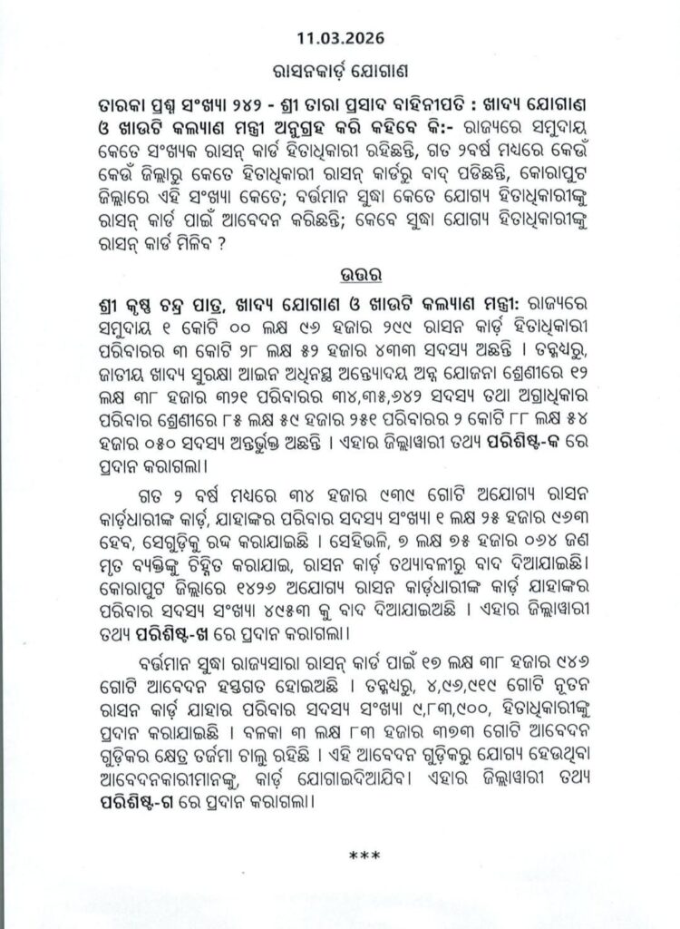 ଭୁବନେଶ୍ଵର,୧୧/୦୩: ରାଜ୍ୟରେ ରାସନ ବଣ୍ଟନ ବ୍ୟବସ୍ଥାରେ ଗୁରୁତର ଅନିୟମିତତା ସାମ୍ନାକୁ ଆସିଛି। ଲକ୍ଷେ କି ଦୁଇ ଲକ୍ଷ ନୁହେଁ, ପ୍ରାୟ ୭ ଲକ୍ଷରୁ ଅଧିକ ଭୂତ ହିତାଧିକାରୀଙ୍କ ନାଁରେ ରାସନ ଲୁଟ ହେଉଥିବା ତଥ୍ୟ ସାମ୍ନାକୁ ଆସିଛି। ଏହାସହ ଲକ୍ଷାଧିକ ଅଯୋଗ୍ୟ ବ୍ୟକ୍ତି ମଧ୍ୟ ରାସନ କାର୍ଡ ହାସଲ କରିଥିବା ତଥ୍ୟ ମିଳିଛି।