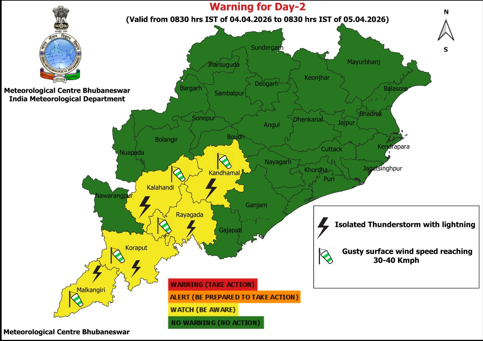ଭୁବନେଶ୍ୱର,୦୪/୦୪:ଆସନ୍ତା ୪ ଦିନ ଯାଏଁ ରାଜ୍ୟରେ ଜାରି ରହିବ ଝଡ଼ବର୍ଷା ପ୍ରଭାବ। କାଲି ସକାଳ ସାଢ଼େ ୮ଟା ଯାଏଁ ବିଜୁଳି ଘଡ଼ଘଡ଼ି ସହ ବର୍ଷା ପବନ ନେଇ ଉତ୍ତର, ପଶ୍ଚିମ ଓ ଦକ୍ଷିଣ ଓଡ଼ିଶାର ୧୨ ଜିଲ୍ଲାକୁ ୟେଲୋ ୱାର୍ଣ୍ଣିଂ ଜାରି କରିଛି ପାଣିପାଗ ବିଭାଗ !ଏହାପରେ ସକାଳ ୮.୩୦ ପରେ କଳାହାଣ୍ଡି, କନ୍ଧମାଳ,ରାୟଗଡା, ମାଲକାନଗିରି ଓ କୋରପୁଟ ଏହି ୫ ଜିଲ୍ଲାରେ ବିଜୁଳି ଘଡ଼ଘଡ଼ି ସହ ହାଲୁକା ବର୍ଷା ସମ୍ଭାବନା ସହ ୩୦ ରୁ ୪୦ କିମି ପବନ ବହିବାର ସମ୍ଭାବନା କୁ ନେଇ ୟେଲୋ ବର୍ଣ୍ଣିଙ୍ଗ ଜାରି କରିଛି ପାଣିପାଗ ବିଭଗ। ୭ ତାରିଖ ଯାଏ ବର୍ଷା ସମ୍ଭାବନା ଥିବା ଆକଳନ କରିଛି ପାଣିପାଗ ବିଭାଗ। ସେପଟେ ଆଗାମୀ ୨୪ ଘଂଟାରେ ବର୍ଷାର ସମ୍ଭାବନା କୁ ନେଇ ୨ ରୁ ୩ ଡିଗ୍ରୀ ତାପମାତ୍ରା କମିବା ସହ ତାତିରୁ ଟିକିଏ ଅସ୍ବସ୍ତି ମିଳିପାରେ ବୋଲି ପୂର୍ବାନୁମାନ କରିଛି ପାଣିପାଗ ବିଭାଗ।
