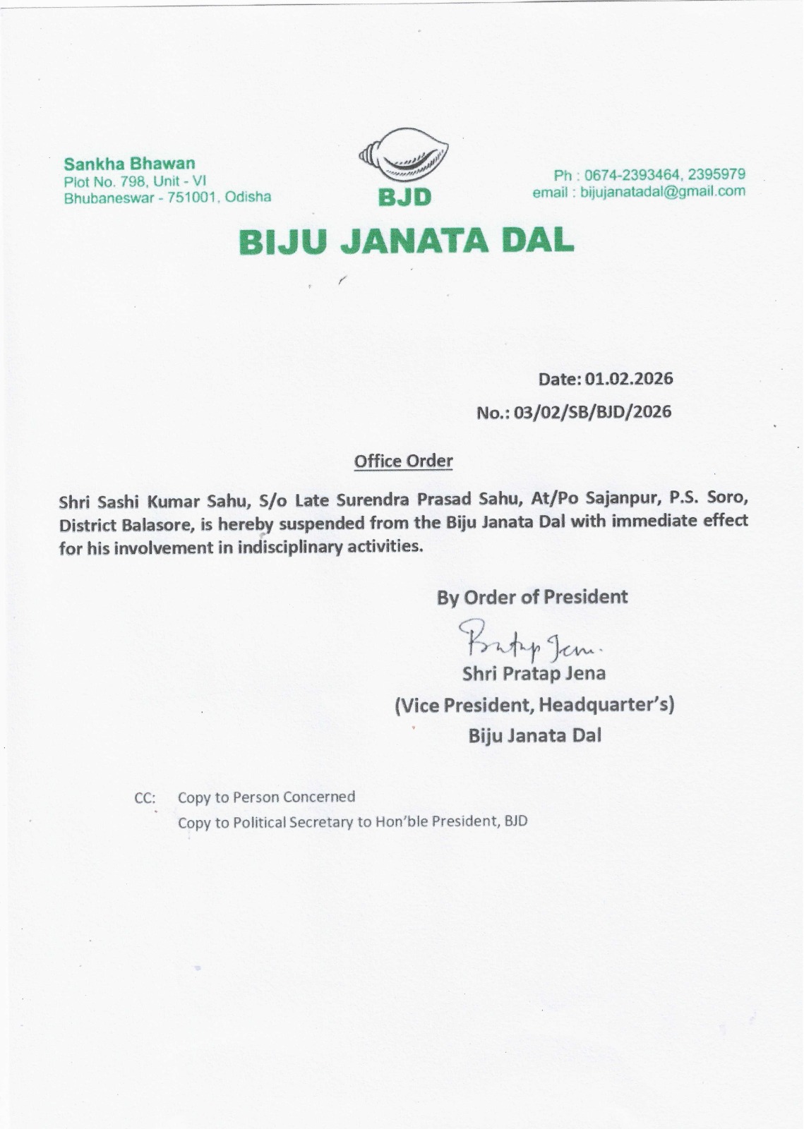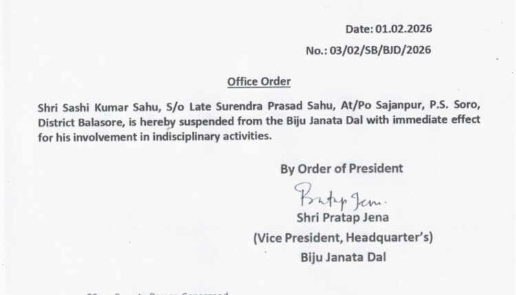 ଭୁବନେଶ୍ଵର,୦୧/୦୨: ଶଶୀ ସାହୁ ଙ୍କୁ ନିଲମ୍ବନ କଲା ବିଜେଡି।ବିଶୃଙ୍ଖଳିତ କାର୍ଯ୍ୟକ୍ରମ ପାଇଁ ବିଜେଡି ରୁ ନିଲମ୍ବିତ ହୋଇଥିବା ପ୍ରେସ ରିଲିଜ ରେ ଉଲ୍ଲେଖ ।ବିଭିନ୍ନ ବିବାଦମୂଳକ ପରିସ୍ଥିତିକୁ ଧ୍ୟାନରେ ରଖି ନିଆଯାଇଛି ଏଭଳି ନିଷ୍ପତି ନେଇଛି ବିଜେଡି ।