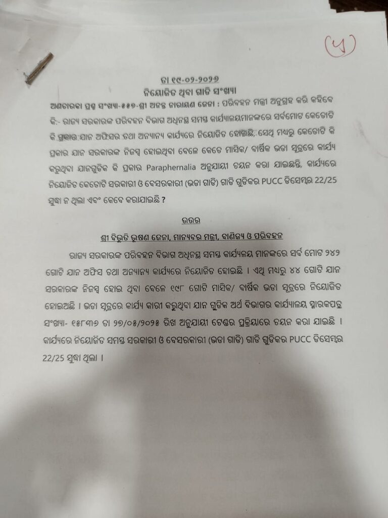 ଭୁବନେଶ୍ଵର,୧୯/୦୨:ବିନା PUCC ରେ ପରିବହନ ବିଭାଗରେ ଗଡୁଛି ମାଳ ମାଳ ଗାଡ଼ି।ବିଧାନସଭାର ଲିଖିତ ଉତ୍ତର ରୁ ଆସିଲା ସାଙ୍ଘାତିକ ତଥ୍ୟ।ରିପୋର୍ଟ କହୁଛି ପରିବହନ ବିଭାଗ ଅଧୀନରେ ଥିବା ସମସ୍ତ କାର୍ଯ୍ୟାଳୟ ରେ ନିୟୋଜିତ ହୋଇଛି ୨୪୨ ଟି ଗାଡ଼ି।ସେଥି ମଧ୍ୟରୁ ୪୪ ଟି ଗାଡ଼ି ରାଜ୍ୟ ସରକାରଙ୍କ ର ନିଜସ୍ୱ ହୋଇଥିବା ବେଳେ ୧୯୮ ଗାଡ଼ି ଭଡ଼ା ରେ ଆଣିଛନ୍ତି ରାଜ୍ୟ ସରକାର।ଏହି ସବୁ ଗାଡି ଗୁଡ଼ିକର PUCC ଅବଧି ୨୨ ଡିସେମ୍ବର ୨୦୨୫ ରୁ ଶେଷ ହୋଇ ସାରିଛି।