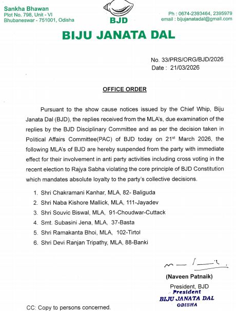ଭୁବନେଶ୍ୱର,୨୨/୦୩:କ୍ରସ୍ ଭୋଟିଂ କରିଥିବା ବିଜେଡିର ୬ ବିଧାୟକଙ୍କୁ ନିଲମ୍ବିତ କରିଛନ୍ତି ବିଜେଡି ସୁପ୍ରିମୋ ନବୀନ ପଟ୍ଟନାୟକ।ଦଳ ବିରୋଧୀ କାର୍ଯ୍ୟ ପାଇଁ ୬ ବିଧାୟକ ନିଲମ୍ବିତ