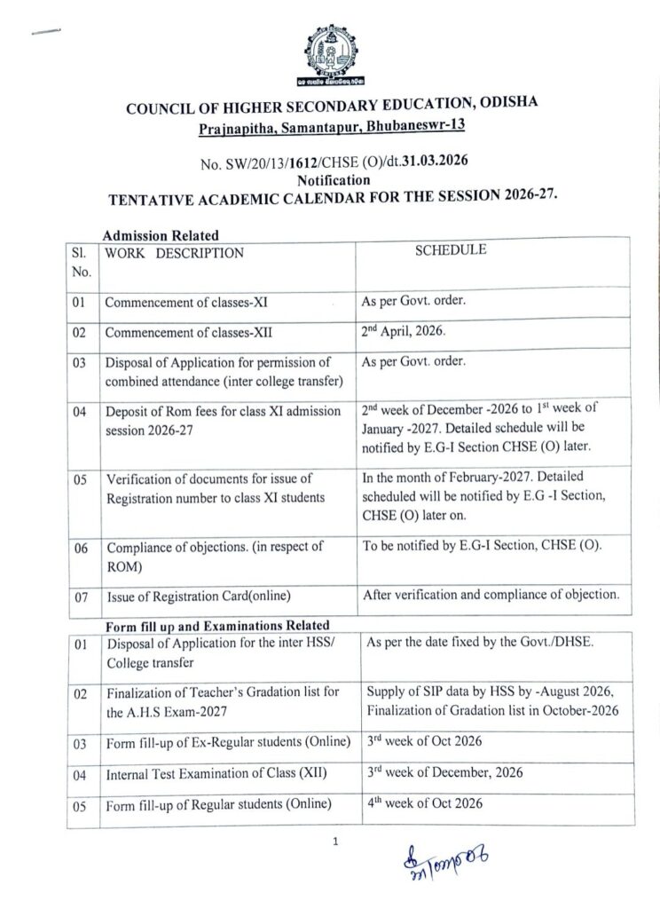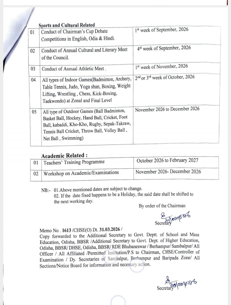 ଭୁବନେଶ୍ୱର,୦୮/୦୪:ଉଚ୍ଚ ମାଧ୍ୟମିକ ଶିକ୍ଷା ପରିଷଦ ପକ୍ଷରୁ ପ୍ରକାଶ ପାଇଛି ଯୁକ୍ତ ୨ ଶିକ୍ଷା ବର୍ଷ କ୍ୟାଲେଣ୍ଡର।ରାଜ୍ୟର ଉଚ୍ଚ ମାଧ୍ୟମିକ ବିଦ୍ୟାଳୟଗୁଡ଼ିକର ଦ୍ବାଦଶ ଶ୍ରେଣୀ ଛାତ୍ରଛାତ୍ରୀଙ୍କ ପାଠପଢ଼ା ଆସନ୍ତା ଏପ୍ରିଲ ତୃତୀୟ ସପ୍ତାହରୁ ଏବଂ ଏକାଦଶ ଶ୍ରେଣୀ ରାଜ୍ୟ ସରକାରଙ୍କ ନିର୍ଦ୍ଦେଶ ଅନୁଯାୟୀ ଆରମ୍ଭ ହେବ।ଉଚ୍ଚ ମାଧ୍ୟମିକ ଶିକ୍ଷା ପରିଷଦ ପକ୍ଷରୁ ଜାରି ଶିକ୍ଷା କ୍ୟାଲେଣ୍ଡରରେ ସୂଚନା ଦିଆଯାଇଛି।୨୦୨୭ର ଯୁକ୍ତ୨ ପରୀକ୍ଷା ପାଇଁ ପ୍ରସ୍ତୁତି ହୋଇଛି ଯୋଜନା। ଯୁକ୍ତ୨ ପ୍ରାକ୍ଟିକାଲ ପରୀକ୍ଷା ୨୦୨୭ ଜାନୁଆରି ପ୍ରଥମ ଓ ଦ୍ବିତୀୟ ସପ୍ତାହରେ ଅନୁଷ୍ଠିତ ହେବ ଏହାପୂର୍ବରୁ ୨୦୨୬ ଡିସେମ୍ବର ୨୦ରୁ ୩୧ ତାରିଖ ଏବଂ ଜାନୁଆରି ୧୦ରୁ ୧୫ ମଧ୍ୟରେ ଦ୍ବାଦଶ ଶ୍ରେଣୀ ଛାତ୍ରଛାତ୍ରୀଙ୍କ ଇଣ୍ଟରନାଲ ଆସେସ୍‌ମେଣ୍ଟ କରାଯିବ।ଫେବ୍ରୁଆରି ଦ୍ବିତୀୟ ସପ୍ତାହ ସୁଦ୍ଧା ପରିଷଦ ନିକଟରେ ପ୍ରାକ୍ଟିକାଲ ମାର୍କ  ଦାଖଲ ହେବ।ଥିଓରି ପରୀକ୍ଷା ପୂର୍ବଭଳି ପେବ୍ରୁଆରି ଦ୍ବିତୀୟ ସପ୍ତାହରୁ ମାର୍ଚ୍ଚ ୪ର୍ଥ ସପ୍ତାହ ମଧ୍ୟରେ ଅନୁଷ୍ଠିତ ହେବ ଏବଂ ୨୦୨୭ ମେ’ ତୃତୀୟ ସପ୍ତାହରେ ଫଳ ପ୍ରକାଶ ପାଇବ। ଉଚ୍ଚ ମାଧ୍ୟମିକ  ଶିକ୍ଷା  ପରିଷଦ  ପକ୍ଷରୁ ଆୟୋଜିତ ହେଉଥିବା ବିଭିନ୍ନ କ୍ରୀଡ଼ା ପ୍ରତିଯୋଗିତା ଡିସେମ୍ବର ମଧ୍ୟରେ ଶେଷ ହେବ ବାର୍ଷିକ କ୍ରୀଡ଼ା ପ୍ରତିଯୋଗିତା ନଭେମ୍ବର ପ୍ରଥମ ସପ୍ତାହରେ ଅନୁଷ୍ଠିତ ହେବ।ଓଡ଼ିଆ, ଇଂରାଜୀ ଓ ହିନ୍ଦୀ ଭାଷାରେ ରେୟାରମ୍ୟାନ୍ କପ୍ ବକ୍ତୃତା ପ୍ରତିଯୋଗିତା ସେପ୍ଟେମ୍ବର ପ୍ରଥମ ସପ୍ତାହ, ବାର୍ଷିକ ସାଂସ୍କୃତିକ ଓ ଲିଟେରାରି ପ୍ରତିଯୋଗିତା ସେପ୍ଟେମ୍ବର ଚତୁର୍ଥ ସପ୍ତାହରେ ଅନୁଷ୍ଠିତ ହେବ ବୋଲି ଉଚ୍ଚ ମାଧ୍ୟମିକ ଶିକ୍ଷା ପରିଷଦ ପକ୍ଷରୁ କୁହାଯାଇଛି। ସମସ୍ତ ଇନ୍‌ଡୋର ଗେମ୍ ଅକ୍ଟୋବର ଦ୍ବିତୀୟ ଓ ତୃତୀୟ ସପ୍ତାହ ଏବଂ ଆଉଟ୍‌ଡୋର କ୍ରୀଡ଼ା ନ‌ଭେମ୍ବର ଓ ଡିସେମ୍ବର ମାସରେ କରା‌ଯିବ ଅକ୍ଟୋବରରୁ ଫେବୃଆରି ମଧ୍ୟରେ ଶିକ୍ଷକ ତାଲିମ କାର୍ଯ୍ୟକ୍ରମ ଏବଂ ନିଭେମ୍ବର-ଡିସେମ୍ବର ମଧ୍ୟରେ ଏକାଡେମିକ ଓ ପରୀକ୍ଷା କର୍ମଶାଳା ଅନୁଷ୍ଠିତ ହେବ ଧାର୍ଯ୍ୟ ହୋଇଥିବା ତାରିଖରେ ପରିବର୍ତନ ହୋଇପାରେ ବୋଲି ମଧ୍ୟ ପରିଷଦ ପକ୍ଷରୁ ପୋଷ୍ଟ କରାଯାଇଛି।