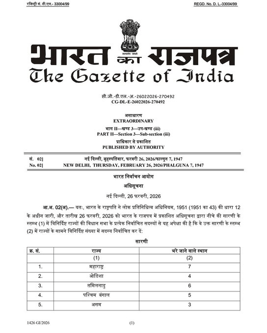 ଭୁବନେଶ୍ଵର,୨୬/୦୨:ପ୍ରକାଶ ପାଇଲା ରାଜ୍ୟସଭା ନିର୍ବାଚନ ପାଇଁ ବିଧିବଦ୍ଧ ବିଜ୍ଞପ୍ତି। ମାର୍ଚ୍ଚ ୧୬ ତାରିଖରେ ହେବ ରାଜ୍ୟସଭା ନିର୍ବାଚନ । ୧୦ ରାଜ୍ୟର ୩୭ ରାଜ୍ୟସଭା ଆସନ ପାଇଁ ନିର୍ବାଚନ ହେବାକୁ ଥିବାବେଳେ ଓଡ଼ିଶାର ୪ ଆସନ ପାଇଁ ହେବ ନିର୍ବାଚନ । ମାର୍ଚ୍ଚ ୫ ତାରିଖରେ ନାମାଙ୍କନ ଦାଖଲର ଶେଷ ତାରିଖ, ୬ ତାରିଖରେ ଯାଞ୍ଚ। । ମାର୍ଚ୍ଚ ୯ ରେ ପ୍ରାର୍ଥୀପତ୍ର ପ୍ରତ୍ୟାହାରର ଶେଷ ତାରିଖ ।ସେହିପରି ମାର୍ଚ୍ଚ ୧୬ ତାରିଖ ସକାଳ ୯ରୁ ଅପରାହ୍ଣ ୪ ଯାଏଁ ଭୋଟ୍ ଗ୍ରହଣ, ଅପରାହ୍ଣରେ ହେବ ଭୋଟ୍ ଗଣତି।