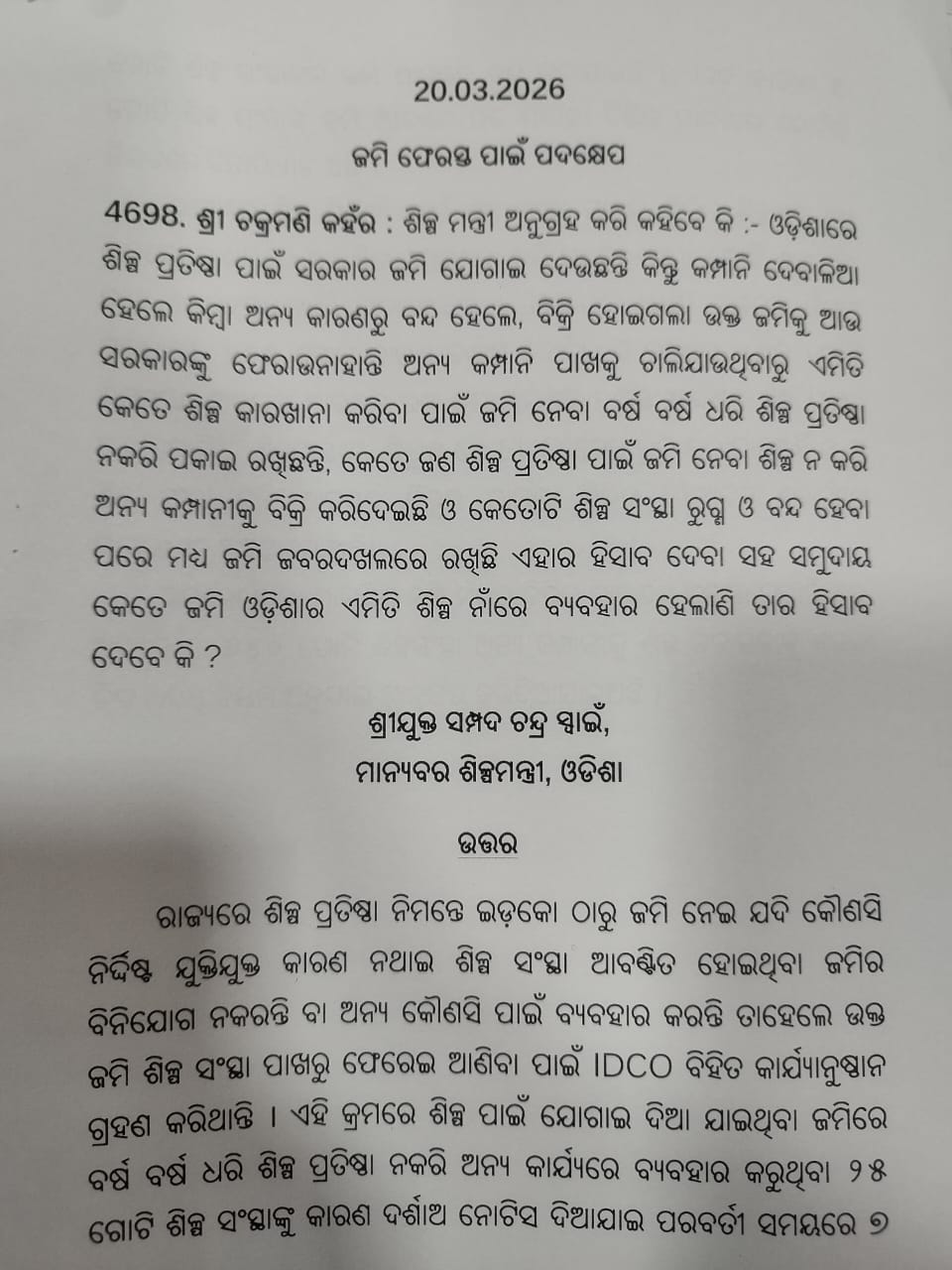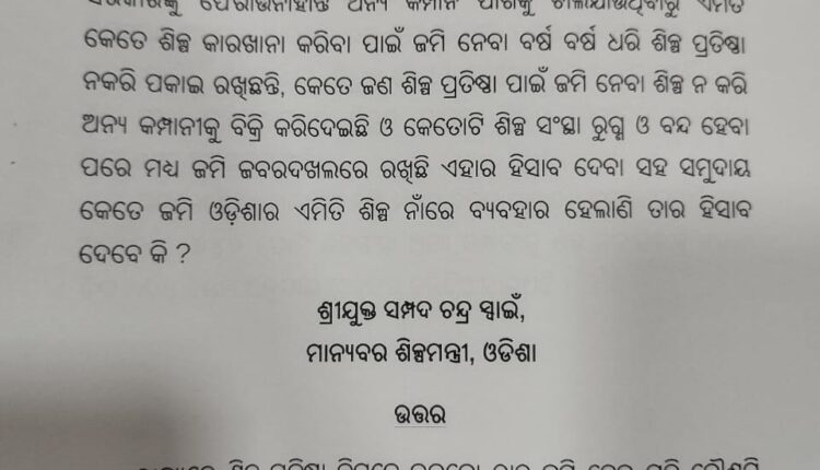 ଏହାଛଡ଼ା, ଇଡକୋ (IDCO) ମାଧ୍ୟମରେ ଆବଣ୍ଟିତ ହୋଇଥିବା ଜମିମାନଙ୍କ ମଧ୍ୟରୁ ୯୧୪ଟି ଶିଳ୍ପ ସଂସ୍ଥା ବନ୍ଦ ପଡ଼ିଥିବା ଜଣାପଡ଼ିଛି। ଏହାମଧ୍ୟରୁ ନିୟମ ଅନୁଯାୟୀ ୬୬୫ଟି ଶିଳ୍ପାନୁଷ୍ଠାନକୁ କାରଣ ଦର୍ଶାଅ ନୋଟିସ ଦିଆଯାଇଥିଲା। ପରବର୍ତ୍ତୀ କାର୍ଯ୍ୟାନୁଷ୍ଠାନରେ ୨୬୭ଟି ଶିଳ୍ପ ସଂସ୍ଥାର ଜମି ଆବଣ୍ଟନ ରଦ୍ଦ କରାଯାଇଛି।ଏହି ରଦ୍ଦ ମାମଲାମାନଙ୍କ ମଧ୍ୟରୁ ୮୧ଟି ଶିଳ୍ପ ସଂସ୍ଥା ବିରୋଧରେ EUO କେସ ରୁଜୁ କରାଯାଇଛି, ଯାହା ଅନୁସନ୍ଧାନ ଓ ଆଗୁଆ କାର୍ଯ୍ୟବାହୀ ପାଇଁ ଚାଲିଛି। ଏହାସହ ୬ଟି ମାମଲା ଆହୁରି କୋର୍ଟରେ ବିଚାରଧୀନ ଅବସ୍ଥାରେ ରହିଛି।ସରକାର ଏହି ସମସ୍ୟାର ସମାଧାନ ପାଇଁ ଅନ୍ୟ ପଦକ୍ଷେପ ମଧ୍ୟ ନେଇଛନ୍ତି। ବିଭିନ୍ନ କାରଣରୁ ଚାଲୁ ନଥିବା ୬୪୦ଟି ଶିଳ୍ପ ସଂସ୍ଥାର ଜମିକୁ ଅନ୍ୟ ଆଗ୍ରହୀ ସଂସ୍ଥାଙ୍କୁ ଲିଜ୍ ଆକାରରେ ଦିଆଯାଇଛି, ଯାହା ଦ୍ୱାରା ଶିଳ୍ପ ଉନ୍ନତି ଓ ଜମିର ସଠିକ୍ ବ୍ୟବହାର ସୁନିଶ୍ଚିତ ହେବ।