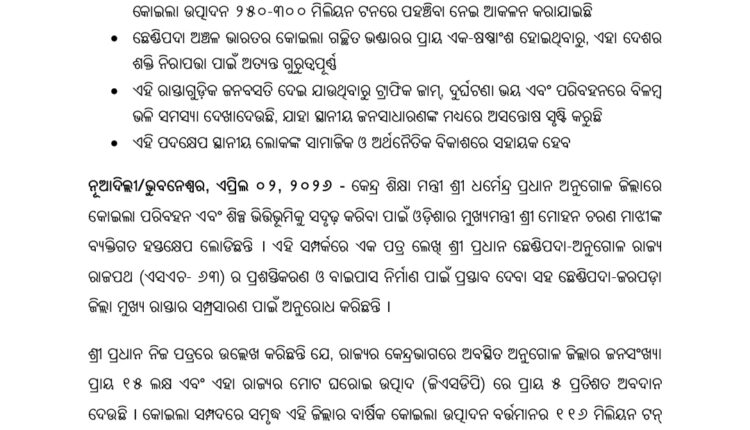 ଭୁବନେଶ୍ୱର,୦୨/୦୪:କେନ୍ଦ୍ର ଶିକ୍ଷା ମନ୍ତ୍ରୀ ଶ୍ରୀ ଧର୍ମେନ୍ଦ୍ର ପ୍ରଧାନ ଅନୁଗୋଳ ଜିଲ୍ଲାରେ କୋଇଲା ପରିବହନ ଏବଂ ଶିଳ୍ପ ଭିତ୍ତିଭୂମିକୁ ସଦୃଢ଼ କରିବା ପାଇଁ ଓଡ଼ିଶାର ମୁଖ୍ୟମନ୍ତ୍ରୀ ଶ୍ରୀ ମୋହନ ଚରଣ ମାଝୀଙ୍କ ବ୍ୟକ୍ତିଗତ ହସ୍ତକ୍ଷେପ ଲୋଡିଛନ୍ତି । ଏହି ସମ୍ପର୍କରେ ଏକ ପତ୍ର ଲେଖି ଶ୍ରୀ ପ୍ରଧାନ ଛେଣ୍ଡିପଦା-ଅନୁଗୋଳ ରାଜ୍ୟ ରାଜପଥ (ଏସଏଚ- ୬୩) ର ପ୍ରଶସ୍ତିକରଣ ଓ ବାଇପାସ ନିର୍ମାଣ ପାଇଁ ପ୍ରସ୍ତାବ ଦେବା ସହ ଛେଣ୍ଡିପଦା-ଜରପଡ଼ା ଜିଲ୍ଲା ମୁଖ୍ୟ ରାସ୍ତାର ସମ୍ପ୍ରସାରଣ ପାଇଁ ଅନୁରୋଧ କରିଛନ୍ତି ।