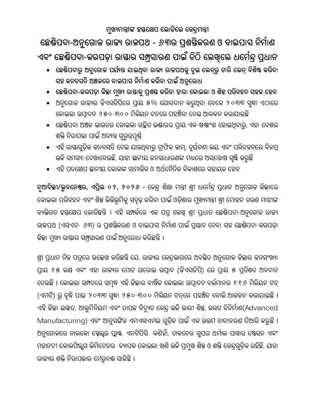 ଶ୍ରୀ ପ୍ରଧାନ ନିଜ ପତ୍ରରେ ଉଲ୍ଲେଖ କରିଛନ୍ତି ଯେ, ରାଜ୍ୟର କେନ୍ଦ୍ରଭାଗରେ ଅବସ୍ଥିତ ଅନୁଗୋଳ ଜିଲ୍ଲାର ଜନସଂଖ୍ୟା ପ୍ରାୟ ୧୫ ଲକ୍ଷ ଏବଂ ଏହା ରାଜ୍ୟର ମୋଟ ଘରୋଇ ଉତ୍ପାଦ (ଜିଏସଡିପି) ରେ ପ୍ରାୟ ୫ ପ୍ରତିଶତ ଅବଦାନ ଦେଉଛି । କୋଇଲା ସମ୍ପଦରେ ସମୃଦ୍ଧ ଏହି ଜିଲ୍ଲାର ବାର୍ଷିକ କୋଇଲା ଉତ୍ପାଦନ ବର୍ତ୍ତମାନର ୧୧୬ ମିଲିୟନ ଟନ୍ (ଏମଟି) ରୁ ବୃଦ୍ଧି ପାଇ ୨୦୩୩ ସୁଦ୍ଧା ୨୫୦-୩୦୦ ମିଲିୟନ ଟନ୍ରେ ପହଞ୍ଚିବ ବୋଲି ଆକଳନ କରାଯାଇଛି । ଏହି ଜିଲ୍ଲା ଇସ୍ପାତ, ଆଲୁମିନିୟମ ଏବଂ ତାପଜ ବିଦ୍ୟୁତ କେନ୍ଦ୍ର ଭଳି ଭାରୀ ଶିଳ୍ପ, ଉନ୍ନତ ବିନିର୍ମାଣ(Advanced Manufacturing) ଏବଂ ଆନୁସଙ୍ଗିକ ଏମଏସଏମଇ ଗୁଡ଼ିକ ପାଇଁ ଏକ ଉତ୍ତମ ବାତାବରଣ ତିଆରି କରୁଛି । ଅନୁଗୋଳରେ ନାଲକୋ ସ୍ମେଲ୍ଟର ପ୍ଲାଣ୍ଟ, ଏନଟିପିସି କଣିହାଁ, ତାଳଚେର ସୁପର ଥର୍ମାଲ ପାୱାର ଷ୍ଟେସନ ଏବଂ ମହାନଦୀ କୋଲଫିଲ୍ଡସ ଲିମିଟେଡର ବ୍ୟାପକ କୋଇଲା ଖଣି ଭଳି ପ୍ରମୁଖ ଶିଳ୍ପ ଓ ଶକ୍ତି କେନ୍ଦ୍ରଗୁଡ଼ିକ ରହିଛି, ଯାହା ରାଜ୍ୟର ଶକ୍ତି ନିରାପତ୍ତାର ମେରୁଦଣ୍ଡ ସାଜିଛି ।