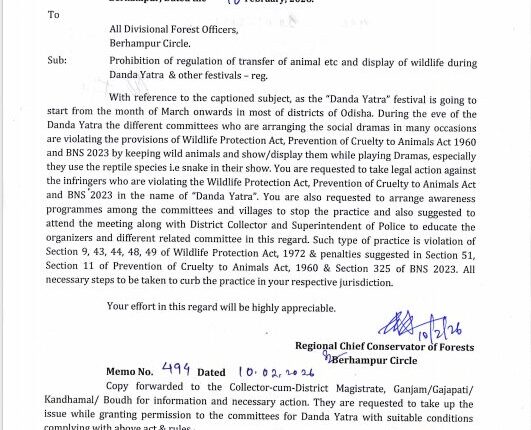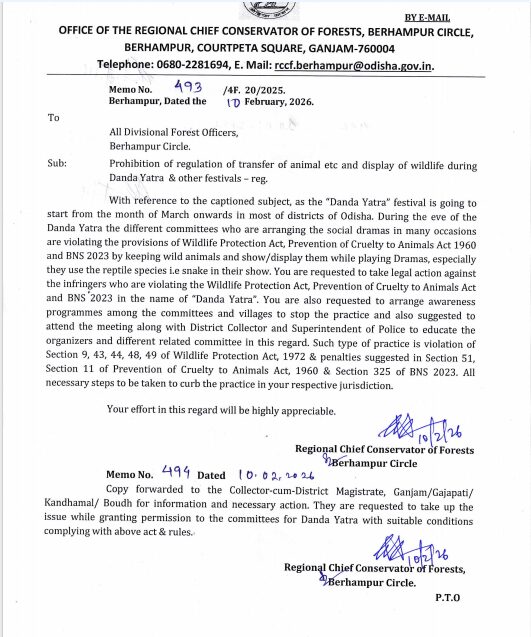 ବ୍ରହ୍ମପୁର,୧୩/୦୨:ଦଣ୍ଡ ଯାତ୍ରାରେ ସାପ ବ୍ୟବହାର ମନା।ଆଗକୁ ଦଣ୍ଡଯାତ୍ରା ଥିବାରୁ ସବୁ ଡିଏଫ୍ଓଙ୍କୁ ବ୍ରହ୍ମପୁର RCCFଙ୍କ ଚିଠି।ଦଣ୍ଡଯାତ୍ରା ବେଳେ ସାପ ବ୍ୟବହାରକାରୀଙ୍କ ଉପରେ କାର୍ଯ୍ୟାନୁଷ୍ଠାନ ପାଇଁ ଚିଠି।ନିୟମ ଉଲଂଘନ କରି ସାପ ବ୍ୟବହାର କଲେ କାର୍ଯ୍ୟାନୁଷ୍ଠାନ ପାଇଁ ନିର୍ଦ୍ଦେଶ।ମଞ୍ଚରେ ନାଟକ ପରିବେଷଣ ବେଳେ କିଛି କଳାକାର ସାପ ବ୍ୟବହାର କରୁଛନ୍ତି।କଡ଼ା ନଜର ରଖିବା ସହ ଉଲ୍ଲଙ୍ଘନକାରୀଙ୍କ ବିରୋଧରେ ଆକ୍ସନ ନିର୍ଦ୍ଦେଶ।ଗ୍ରାମବାସୀଙ୍କ ମଧ୍ୟରେ ସଚେତନତା ପାଇଁ ବିଭିନ୍ନ କାର୍ଯ୍ୟକ୍ରମ କରିବାକୁ ନିର୍ଦ୍ଦେଶ