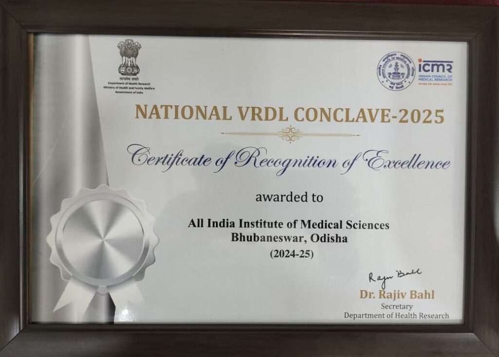 ଏମ୍ସ ଭୁବନେଶ୍ୱର ଭିଆର୍ଡିଏଲ୍କୁ ଭାରତ ସରକାରଙ୍କ ଭାଇରାଲ୍ ଡାଇଗ୍ନୋଷ୍ଟିକ୍ସ ଏବଂ ଗବେଷଣାରେ ଉତ୍କର୍ଷତା କ୍ଷେତ୍ରରେ ରୌପ୍ୟ ପୁରସ୍କାର ପ୍ରଦାନ